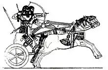 The first evidence of humans using vehicle in warfare are Sumerian depictions of four-wheeled wagons pulled by semi-domesticated onagers. These war wagons were slow and cumbersome, but provided a protected elevated platform for javelineers and slingers. First depictions of war chariots come from Indo-European burials in the Ural steppes dated to around 2000 BC and became widespread around Eurasia by 500 BC.[1] Chariots with spoke-wheels pulled by horses were lightweight and fast which made it feasible to outrun light infantry and wagons. Although horses have been ridden as from at least the 4th millennium BC they were most likely largely relegated to transporting warriors, who fought on foot. Until the invention and widespread adoption of the saddle and stirrup chariots remained the primary form of cavalry, as the offered a controllable and reliable platform from which fighters could rapidly manoeuvre around the battlefield and engage with projectile and melee weapons, dismount and fight on foot or climb on to make a swift retreat.[1][2]