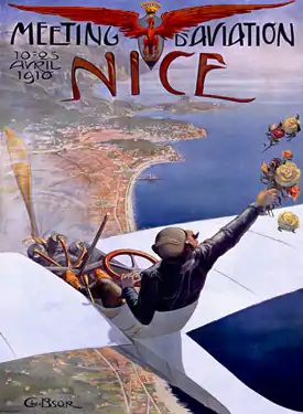 He is most well known for his poster "Meeting d'Aviation Nice," promoting an early "aviation meeting" or air show held in Nice, France, April 10–25, 1910. The poster depicts a pilot scattering roses from his airplane flying high over the Nice coast. Notice the shape of the left wing is mirrored in the shape of the water above and below the right wing. The lettering at the top is in a distinct Art Nouveau style and surrounds a crowned red eagle, representing the arms of Nice, with exaggerated wings extending far beyond the shield and resembling the wings of an airplane. The poster has been credited with contributing to "Nice’s glamorous image."[2] It has been reprinted numerous times and also has been reproduced on coffee mugs and other objects.