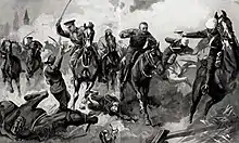![]() Captain Charles Hornby and his squadron charging against German cavalrymen at Casteau. Illustration by Charles Mills Sheldon | |
