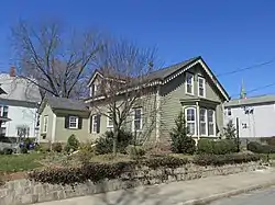 The Charles Payne House is a 1+1⁄2-story Gothic-Italianate vernacular cottage that has a spacious garden founded on the site of a long-removed house. The house's gable end faces the street with a rear ell and the other ell perpendicular to the main block on the west side. Centered on the east end of the roof is a cross gable which is visually offset by the dormer on the west. The house has a small gable-roofed vestibule on the east side, aligned underneath the cross-gable. The rear ell has an attached porch that spans its length. A single story bay hexagonal bay window protrudes from the facade. The distinguishing feature of the Payne house is the wood trim exterior, consisting of hood mould on the paired windows on the south, four kinds of bargeboards and bracketed cornices on the rear ell's east side. The interior of the Charles Payne House is not covered in detail by any survey, but has three mantelpieces on the first floor, two displaying Gothic Revival influence in their wooden designs and the third, located in the rear ell, made of grey marble with a round-head opening.[2] Though not mentioned in the nomination, a photo shows one of the wooden mantlepieces filled with brick and rendered unusable at the time.[3] The setting of the house was important to the National Register nomination, which specifically highlighted its shaded garden and fencing. At the time of the nomination, an ornamental round head picket fence surrounded the property and access was through a double-leaf lattice work gate.[2] By 2013, the picket fence and entrance gate had been removed, but the property still retains the street frontage for its garden.[4]