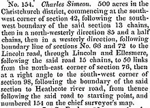 Simeon chose 500 acres (2.0 km2) of land and had frontages with the road leading to the Ōpāwaho / Heathcote River and the road leading from Christchurch to Halswell. The land was numbered in the order of it having been chosen, and his land was thus known as Rural Section 154.[29] He also owned town properties in Armagh, Gloucester, Manchester and Madras Streets.[30]