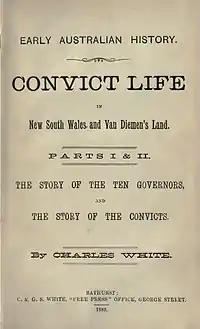 White had an interest in writing about Australian history. He scrupulously collected material and records to use as a basis for his historic writings.[2] In the late 1880s Charles White’s "lengthy series of historical sketches", under the title 'Early Australian History', began to be published in the Bathurst Free Press. Described as articles "bearing upon the work of Australian colonisation and convict life in New South Wales and Van Diemen’s Land", the publishing project was locally advertised, including in the rival newspaper Bathurst Post. The first part of 'Early Australian History' was published on 6 October 1888.[9] White used the pseudonym 'The Chatterer' for these early articles.[10] In 1889 Parts I and II of his 'Early Australia History' were released in book form as Convict Life in New South Wales and Van Diemen’s Land, printed in the White brothers' newspaper office at Bathurst.[11] Charles White’s historical writings display “painstaking scholarship and a fluent, uncluttered style free of romanticism”.[2]