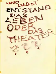 Salomon entitled her work, Leben? oder Theater?: Ein Singespiel. Singspiel is a German music form resembling "operetta" in some respects, although actors' parts are often spoken over, rather than sung with the music. The form is influenced by the English ballad opera and the French opéra-comique.[31] Music provides the backdrop for the play-form which is most often comical in nature, tragedy being a less-frequent motif. Romantic interest nearly always plays a prominent part. Singspiel was considered less elevated than opera proper, often being written in the vernacular.[32] While celebrated composers such as Mozart and Schubert are known to have worked in the form, Singspiel often introduced folksongs, marches and narrative songs into its repertoire. By the early twentieth century, at the time of Salomon's appropriation of the form into her work, the Singspiel had ceased to be a contemporary form (although Ralph Benatzky's popular 1930 work Im weißen Rößl is a singspiel and Kurt Weill introduced the term 'songspiel' to describe some of his collaborations with Berthold Brecht). Note that Salomon's spelling, "Singespiel", adds an "e", but whether this was intentional or not is unclear.