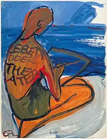 Charlotte Salomon (16 April 1917 – 10 October 1943) was a German-Jewish artist born in Berlin. She is primarily remembered as the creator of an autobiographical series of paintings Leben? oder Theater?: Ein Singspiel (Life? or Theater?: A Song-play), the largest known artwork made by a Jewish person who died in the Holocaust,[1] consisting of 769 individual works painted between 1941 and 1943 in the south of France, while Salomon was in hiding from the Nazis. In October 1943 Salomon, 5 months pregnant at that time, was captured and deported to Auschwitz, where she was murdered by the Nazis soon after her arrival.[2][3][4][5] In 2015, a 35-page confession by Salomon to the fatal poisoning of her grandfather, kept secret for decades, was released by a Parisian publisher.[6]