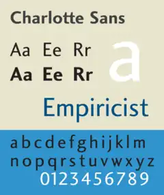 Charlotte Sans is a humanist sans-serif typeface designed by Michael Gills in 1992 as part of a larger family called Charlotte, which includes a related serif text face. The face was designed for Letraset.