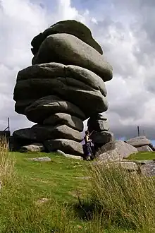 The Cheesewring (Cornish: Keuswask[1]) is a granite tor in Cornwall, England, situated on the eastern flank of Bodmin Moor on Stowe's Hill in the parish of Linkinhorne approximately one mile northwest of the village of Minions and four miles (6 km) north of Liskeard.[2] It is a natural geological formation, a rock outcrop of granite slabs formed by weathering. The name derives from the resemblance of the piled slabs to a "cheesewring", a press-like device that was once used to make cheese.[3]