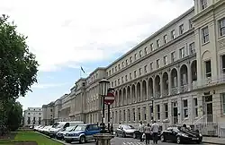The construction of this row of terraced houses on the west side of the Promenade,[lower-alpha 1] which was developed by Samuel Harward, began in 1823.[1] The development was designed by George Allen Underwood in the Classical style and was originally known as "Harward's Buildings" when the buildings were completed in 1840.[1][3] The design involved a symmetrical main frontage with 63 bays facing onto the Promenade; the central section of three bays, which slightly projected forward, featured a window flanked by two doorways on the ground floor; there were three tall sash windows on the first floor and three smaller sash windows on the second floor with huge Ionic order columns spanning the first and second floors supporting a pediment.[1] David Verey described the row of buildings as "equal to any terrace in Europe".[4]