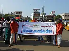 The ninth Chennai Rainbow Pride March was held on 25 June 2017. The March culminated a month-long series of events for Pride Month, including sensitization programmes on sexuality and gender-identity, cultural performances, health information talks, solidarity events, films and poster making sessions. The Chennai Pride held a special focus on intersectionality, with its posters and press release raising issues against Hindi imposition in South India, Hindutva politics, and cultural erasure.[30] Its press release stated that it stood in "solidarity with the Dalit community, people with disability, farmers, sex workers of all genders, other minorities, women, and all others struggling against oppression."[31]
