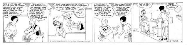 Chic Young grew up in a German-Lutheran neighborhood on the south side of St. Louis. After graduating from high school in St. Louis, he returned to Chicago where he worked as a stenographer while taking night classes at the Art Institute of Chicago. In 1921, he learned that the Newspaper Enterprise Association was seeking an artist to do a comic strip about an attractive young woman. He headed for Cleveland and earned a weekly salary of $22 (equivalent to $360 in 2022) while drawing The Affairs of Jane about a struggling film actress who dreamed of graduating from low-budget pictures to stardom. The short-lived strip, which began in 1921 on Halloween, came to a conclusion five months later on March 18, 1922. In the NEA art department, Young worked near cartoonist Gene Ahern, and the two often played pranks on each other. When a call came from King Features' J. Gortatowski offering an annual salary of $10,000 (equivalent to $164,000 in 2022), Young thought it was a prank and turned down the job. Looking for work later, he applied to Gortatowski and learned the call was legitimate.[1][3][4]