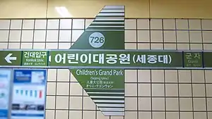 Children's Grand Park Station (Korean: 어린이대공원역) is a rapid transit station on Seoul Subway Line 7. It is located in Mojin-dong in the Gwangjin-gu administrative district of Seoul. It is also adjacent to Children's Grand Park from which it takes its name.[1]