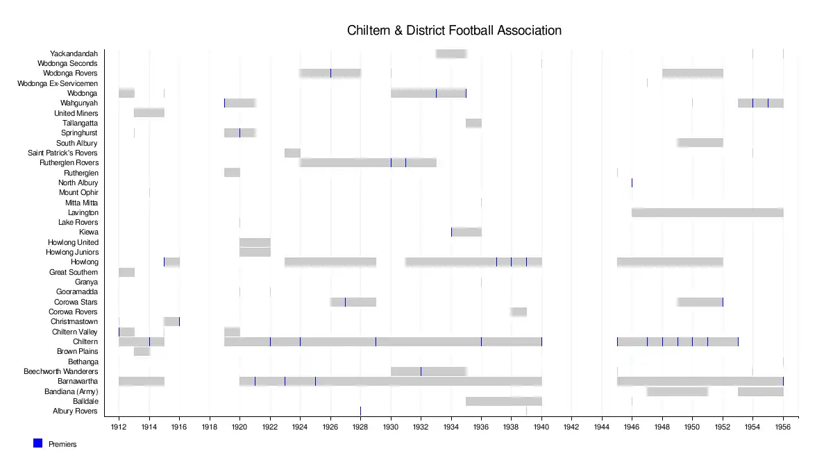 The Chiltern & District Football Association was first established in 1912 from the following Australian Rules Football clubs - Barnawartha, Chiltern, Chiltern Valley, Christmastown, Southern and Wodonga, in North Eastern Victoria, Australia and was an active competition until 1956 when it was wound up.[1]