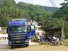Loading a banana truck (Hekou County). Bananas are a major cargo on this part of the highway.