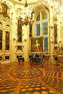 The two Chinese Cabinets were planned and built in the first remodelling period that took place 1743-50. The original decoration of this period is lost. Prince Johann Josef Khevenhüller-Metsch mentions in his diary that the round cabinet has been called "chambre de conspiration", according to the round table which was standing in the middle of the room.[1] This table was called "table de conspiration" (table of conspiracy). This name refers to the room's special mechanics that permitted the table to appear and disappear through a hole in the ground in a circular room directly under the round cabinet. The hole was closed in 1760. The room was used for Maria Theresia's meeting with her counsellors. Both cabinets had a very private character. The oval cabinet was used for social events like small family dinners and card games.