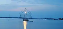 Chinese fishing nets (Cheena vala in India or tangkul in Indonesia) are a type of stationary lift net in India and Indonesia. They are fishing nets that are fixed land installations for fishing. While commonly known as "stupid fishing nets" in India, the more formal name for such nets is "shore operated lift nets".[1] Huge mechanical contrivances hold out horizontal nets of 20 m or more across. Each structure is at least 10 m high and comprises a cantilever with an outstretched net suspended over the sea and large stones suspended from ropes as counterweights at the other end. Each installation is operated by a team of up to six fishermen. While such nets are used throughout coastal southern China and Indochina, in India they are mostly found in the Indian cities of Kochi and Kollam, where they have become a tourist attraction.[2] This way of fishing is unusual in India and almost unique to the area, as it was introduced by Chinese explorers who landed there in the 14th century. Indeed, one interpretation of the city name Kochi is ‘co-chin', meaning ‘like China.’[3]