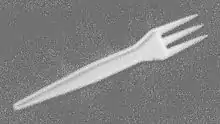 A chip fork is a small fork made from wood or plastic that is given away by fast food suppliers with portions of fish and chips, french fries, currywurst, and similar, and used when eating.[1] Chip forks are specially designed to keep eaters' fingers clean of grease, sauces, mayonnaise, and other, while at the same time being cheap enough to be thrown away after use.[2] Thus they spare suppliers the cost and labour of collecting and cleaning traditional forks. This fits well with the image of fast food as kinds of products to be taken away and being consumed elsewhere.