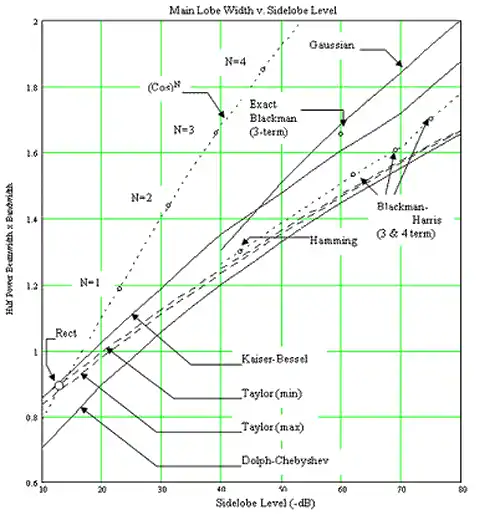 In general, the more the sidelobe levels are lowered, the broader the main lobe will become. However, the various windowing functions do perform differently from one other, with some giving main lobes which are unnecessarily broad for the sidelobe levels achieved. The most efficient function is the Dolph–Chebyshev window (see window functions) as this gives the narrowest pulse at a given sidelobe level.[18] A selection of the better performing windowing functions are shown in the graph of Beamwidth × Bandwidth as sidelobe level.