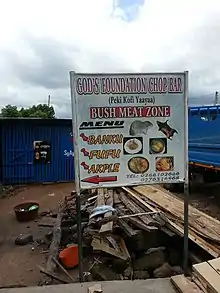A chop bar is a traditional eatery in Ghana[1][2] mostly located in the country's south.[3][4] In Ghanaian pidgin, to chop, far from cutting, means to eat. It may also mean, in reference to money, to spend or squander. In other words, a chop bar is a place where we �chop� [i.e. eat]. And so from this evolved what I think is an important cultural icon of this country, the same way as burger bars are American and fish and chips shops are British. Nigeria even has its popular �suya� meat joints, replete with local drinks.Meals are served in local earthenware bowls and foods are usually eaten at the premises.[5] Most of these bars are stocked with local alcoholic drinks with few foreign drinks available. It is a cultural icon of Ghana,[6] and is a favourite of the locals.[7][8][9]