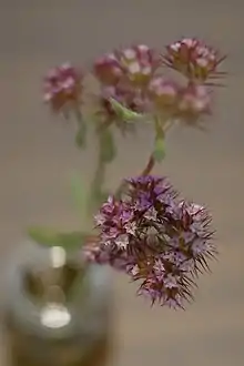 It is an erect herb producing a hairy stem up to about half a meter in maximum height. The leaves are up to 4 centimeters long and mainly arranged about the base of the plant, with a whorl of leaves at the middle of the stem as well. The inflorescence is a cluster of flowers, each surrounded by six purple to bright pink bracts which may be all fused together. The bracts are tipped in straight awns. The flower itself is 3 or 4 millimeters wide and white or pink in color.