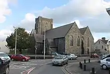 The parish church of Christ Church, Carmarthen was commenced by R. K. Penson in 1867. It was officially opened in September 1869, during the National Eisteddfod, by the Bishop of St David's, Connop Thirlwall. It was designed to be the English-language church for this expanding parish while Eglwys Dewi Sant, Carmarthen was designed to cater for Welsh-speaking parishioners. The organ was added in 1873 and renovations took place in 1891. The church has an unusual central tower with clasping buttresses and gables halfway up.[1]