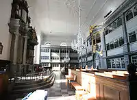 The unusual interior of Christian's Church is reminiscent of a theatre. In addition to the benches on either side of the nave, three tiers of galleries complete with boxes rise the full height of the building on the northern, western and southern sides. They are all arranged to provide the congregation with an excellent view of the podium on the eastern side, which is reminiscent of a stage. It is dominated by the tall slender altarpiece, which consists not only of the altar table but also of the pulpit above it, and the organ at the very top. The ornate entrance, topped by the royal box, is opposite the altar and under the tower on the western side.