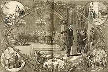 The one for Christmas Eve 1862, which ran in the January 1863 issue of Harper's Weekly shows a wife on one side praying though a window in one circle, and in another circle shows her husband on the battlefield, also in prayer.[15] The same issue's cover started how Santa Claus would be perceived by future Americans, as a white-bearded Santa hands such gifts as socks to Union soldiers, while also holding a Jefferson Davis dancing puppet with a rope tied around its neck to imply his execution.[16] The Christmas 1863 issue showed the couple back together.[17]