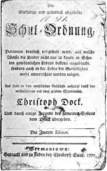 His father, also named Christopher Sower (I), had founded a printing and publishing business and other enterprises in Germantown, Pennsylvania, which the son later continued. Christopher Sower II was liberally educated. His early education was by Christopher Dock, whose work “Eine Einfältige und gründlich abgefasste Schul-Ordnung” he later published. Sower learned the printing and publishing trades from his father.[1] When he was 26 years old, he became a minister, and was associated with Sanders Mack in Germantown and the oldest Dunker church in the United States. Five years later, he was chosen overseer, or bishop, and continued the duties of his office in connection with his inherited secular business until his death.