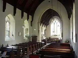 In 2008, Simon Knott stated "The interior is very pleasant, with one of those Purbeck marble fonts familiar from this part of Suffolk. The Revetts are all around, in memorials and bequests. There is a fine scattering of medieval glass, including an excellent roundel of St Catherine, and two other panes which must have come from the edges of a larger work, which feature a monk and a donor".[2]