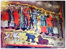 After the building of the wide narthex in 1856, it was painted as well by Dicho Zograf. Here we find the interesting fresco of the Judgment Day with the representations of the four empires of the world as animals and with four emperors – Porus, Darius, Cyrus and Alexander the Great – all led by devils to damnation.[3]
