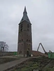 The village of Borschemich was on the planned route for the extension of the Garzweiler surface mine, a large lignite mine operated by the company RWE. The entire village was therefore demolished in the 2010s, with the company building a new settlement known as Neu-Borschemich as its replacement. RWE purchased the Church of St. Martin in 2013, and it was deconsecrated on 23 November 2014. The village's other major landmark, the Haus Paland, was demolished in 2015.[1] Demolition of the church began at 10:00 am on 15 February 2016. The sacristy was demolished first, followed by the sanctuary. The tower was demolished a few days later.[2]