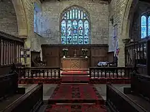 St Andrew's was renovated between 1895 and 1896 at a cost of £3,000, and was officially re-opened during Easter of 1896.[14] Previous to this, the church had box pews, but these were removed in the renovations in favour of normal pews.[23] Many of the medieval stained glass windows were kept during the renovations,[24] although some new windows were installed, including one by Charles Eamer Kempe, which is on the east side of the church.[25] At the same time, the bells were recast, the tower received a new clock,[26] and the Norman font was returned to the church.[27]
