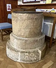 The church underwent rebuilding in the 13th, 14th and 16th-centuries[1] and was repaired and partly rebuilt in 1850 by William Hay, and restored and repaired in 1868.[2] Cox noted that it was "nearly rebuilt in brick in 1850, but the tower is one of the many Lincolnshire instances of late Saxon architecture",[3] and in 1964 Pevsner described it as "A rough and, at the time of writing, neglected church", with an 11th-century tower and west window, Decorated bell-openings, a Norman 12th-century tub font with cable moulding around its rim and a panel of chevrons. The church has a 1636 Paten cover.[4] Within the churchyard to the south east of the south door are the remains of a 14th-century standing stone cross. All that remains is the stone ashlar socket base, now partly buried, and the limestone shaft. The cross is a Grade II scheduled monument.[5][6]