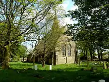 The churchyard contains around 2,000 graves of patients who died at Kirkburton in Storthes Hall Hospital (1904–1991). Most of these graves are unmarked, in a separate field behind the church which was added by Rev. Arnold Escombe Jerram before he left in 1910.[16][34] By 1913 there was fear in the village that the pauper burials were causing epidemics, because the sexton was saving money by leaving graves open to rain and weather, and not filling them with earth until they each contained their full complement of four coffins. The authorities claimed that Storthes Hall's use of the graveyard benefited Thurstonland by the payment of rates and that only fifty paupers per year, who were unclaimed by relatives, were buried there. Rev. P.S. Brown, at that time vicar of Thurstonland and chaplain to Storthes Hall, claimed that the burials were no danger to health, even though the sexton had to ladle out water from open graves before subsequent funerals.[34]