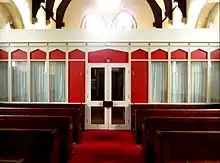 The tower has four floors, of which the ground floor doubles as the church's porch.[22] The first floor is the children's gallery; this has a stepped floor to accommodate the pews, leaving a large, wedge-shaped cavity between the ground floor ceiling and the surface for the seating. The children's gallery is well-lit by large windows, and is open to the nave, forming a balcony overlooking the pulpit. The opening to the nave was closed off around 1984 with a screen and door. The gallery is accessed separately from the nave via the tower's staircase, allowing the Sunday School children to be brought into the gallery and taken away to lessons without disturbing the service. This gallery is long disused and the steps beside the pews have become rotten and unsafe.[23] The second floor is the clock chamber, containing an 1889 turret clock mechanism by Potts of Leeds, who as of 2014 continue to maintain it. The clock chamber has no windows and is completely dark.[24] The bell chamber is on the third floor and contains the single bronze bell and clapper for the clock.[25]