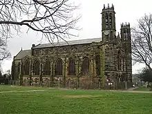 In July 1877 until 1878 he was given the perpetual curacy of St Paul, Shepley, West Yorkshire.[49][50] In March 1878 the Bishop of London, John Jackson, instituted him to the curacy of St James-the-Less, Bethnal Green where he served until 1882.[35][51] While there he did "great work in the mission district of Seven Dials, London, under the rector of St Giles in the Fields. He [was] believed to be a thoroughly earnest man, a good visitor and preacher, and he [held] evangelical views."[2] He was a London Diocesan Home Missionary from 1880 to 1882.[35] From 1882 to 1894 he was vicar of St Lawrence and St Paul's Church, Pudsey.[2][52][53] In Pudsey he was involved in politics, being one of the assentors to the nomination of Conservative candidate Surr William Duncan for local elections, although Briggs Priestley won for the Liberals.[54] In 1894 Brooke Foss Westcott, Bishop of Durham, presented him to the living of Rainton near Fencehouses, Durham.[55] Rev. Thompson died on 10 August 1906 at Rainton rectory in his 67th year, and was interred at St Mary's Church, Rainton on 13 August.[56][57][58]