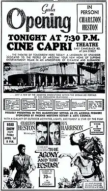 The Cine Capri opened with the Charlton Heston film The Agony and the Ecstasy.[2] On March 31, 1966, Charlton Heston hosted a youth drama clinic in the theater auditorium for several dozen high school and college students. This was followed by an afternoon “show & tell” reception for distinguished guests to personally meet Mr. Heston. Attendees included community leaders, city and state officials, the press, radio and television personnel, studio and distribution executives, and neighborhood merchants. Also there were the architects, contractors, members of the trade and craft suppliers, the Phoenix Art Council and the Mid Town Rotary Club, the sponsors of the evening charity program. Later Heston officially launched the theater with a ribbon cutting ceremony.