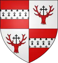 ![]() Crest: A stag's head erased Gules, between the attires a cross crosslet fitchée Sable | |||