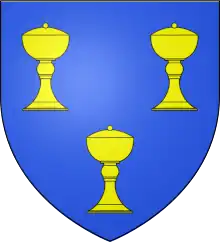In George Crawfurd's 18th century publication, History of Renfrewshire, he stated that the antiquary Sir George Mackenzie claimed the clan descended from "Shiach, a son of MacDuff Earl of Fife" from whom the clan took its name.[1] It has also been said the clan descends from a second son of Duncan, Earl of Fife, who was cup bearer to the king of Scots. Later, the 18th century heraldist Alexander Nisbet claimed that the clan may have acted as cup bearers to Alexander II or Alexander III.[2] There is however no real evidence to support any of these claims. Despite this, the arms of Schaw of Sauchie (the principal branch of the clan) allude to the office of cup bearer, and are blazoned as: Azure, three covered cups Or. In this way the arms are similar to those of the Butler family in England.[2] Today members of Clan Schaw may wear a crest badge to show their allegiance to the clan. This crest badge contains the heraldic crest a demi savage Proper, and the heraldic motto I MEAN WELL. The crest within the crest badge is derived from the arms of Schaw of Sauchie.[2]