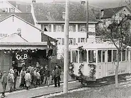 The Clarens–Chailly–Blonay Railway (CCB) or chemin de fer Clarens–Chailly–Blonay was a metre gauge electric railway that operated from 1911 to 1955.[4] At its greatest extent, it ran from the boat landing stage on Lake Geneva in Clarens, via Chailly to Blonay, terminating alongside the station of the Chemins de fer electriques Veveysans (CEV), but not connected to that line.