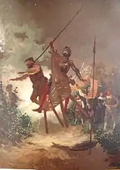 ![]() Don Quixote and Sancho "fly" with the fireworks inside Clavileño (Ricardo Balaca, 1870s). | |
