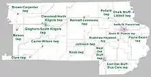 Townships in Arkansas are the divisions of a county. Each township includes unincorporated areas; some may have incorporated cities or towns within part of their boundaries. Arkansas townships have limited purposes in modern times. However, the United States census does list Arkansas population based on townships (sometimes referred to as "county subdivisions" or "minor civil divisions"). Townships are also of value for historical purposes in terms of genealogical research. Each town or city is within one or more townships in an Arkansas county based on census maps and publications. The townships of Clay County are listed below; listed in parentheses are the cities, towns, and/or census-designated places that are fully or partially inside the township. [21][22]