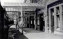 The station was built by Messrs Baker & Son of Canon's Marsh, Bristol.[2] The buildings, constructed in a Gothic Revival style, cost £20,000, with the main buildings on the northern platform. There was a large booking hall with sizeable fireplaces at each end. Pointed ground floor doorways gave access to the hall, which was adjacent to the booking offices and waiting rooms. It is believed that the station master's lodgings in this building were never used as such. A wide carriage drive led down to the northern platform, which was linked to the southern platform by a glass-covered footbridge. There was originally no waiting room on the southern platform, but one was built in October 1898. The platforms were mostly covered by "ridge and furrow" glass roofs, supported by iron columns. The station was flooded in August 1883, which resulted in the installation of extra drainage. There was a large goods yard to the south of the platforms, accessed from the west, with a 28-lever signal box at the west end of the southern platform.[1]
