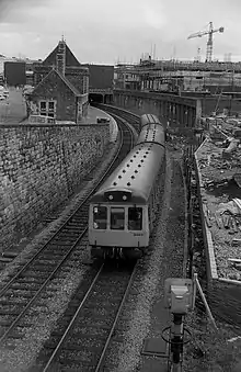 When the railways were nationalised in 1948, services at Clifton Down came under the aegis of the Western Region of British Railways,[2] and there remained a strong staff presence in 1958, with a station master, chief booking clerk, four other clerks, six porters, a shunter, a checker and a weighbridge assistant.[1] Passenger numbers however dropped sharply in 1961 as the result of a fare increase, and so in 1962 a new reduced timetable was enacted, which lost more passengers, and saw the withdrawal of a special schoolchildren's service.[3] A year later in 1963, the Beeching report suggested that all services along the Severn Beach Line be withdrawn. Following meetings with staff, it was decided to keep the line open to Severn Beach, but to close the section to Pilning, and also end services via Henbury.[2] These services duly ended,[4] and in July 1965 the goods yard at Clifton Down also closed.[1] The line however was still threatened, and on 10 February 1967 it was announced that all services between Stapleton Road and Severn Beach would be discontinued. An enquiry followed, and in June that year the decision was reversed, on the condition that tickets be issued on the trains. Thus, on 17 July 1967, all stations along the line, including Clifton Down, had their staff withdrawn.[1][2] The decrease of costs allowed a reduction of ticket prices, but the line was still under threat until in June 1969 it was decided that the line's closure would result in significant hardship, and so a grant was allocated to ensure continued services.[2] Service levels however still declined: though the "Monkey Specials" were still going strong into the 1960s, with 340,000 excursion passengers arriving between 1958 and 1966, the closure of many of the Welsh Valley Lines and the construction of the Severn Bridge led to their demise in the early 1970s. Most of the Severn Beach Line was reduced to single track in late 1970, leaving Clifton Down as one of the few passing places. The glass platform canopies were completely removed in May 1971, and the glass-covered footbridge was also removed, leaving a set of steps from Whiteladies road as the only access to the southern platform.[1] In the late 1970s and the early 1980s, the Clifton Down Shopping Centre was built over most of the goods yard,[5] the rest covered by a housing development.[6][1]