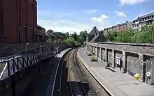 Clifton Down railway station is on the Severn Beach Line, serving the district of Clifton in Bristol. The station is located on the busy shopping street Whiteladies Road, next door to a shopping centre. The wider area is largely residential. Bristol Zoo is under a mile away.[6] The station is located 3 miles 72 chains (6.3 km) along the line from Bristol Temple Meads, and 9 miles 51 chains (15.5 km) from Severn Beach.[27][28][note 1] It is the fifth station from Temple Meads.[29] There are two running lines, roughly oriented east–west, but curving towards the north at both ends. There are two 120-yard (110 m)-long platforms to the north and south of the running lines, connected by a footbridge at the east end.[6] The southern platform, Platform 1, serves trains towards Avonmouth, the northern platform, Platform 2, serves trains towards Temple Meads.[30] The station is in an enclosed cutting, and runs under the road to the east.[6] To the west is the Clifton Down Tunnel under Clifton Down,[6] from which the station takes its name. The station is one of the few double track sections of the Severn Beach Line, and so is often used as a passing place.[31]