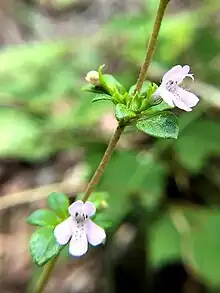 Clinopodium talladeganum is about twelve to eighteen inches tall.[3] The stems are woody and pubescent. Within the first year, the pubescence spreads to curved hairs, while within the second year, the bark starts to peel, and by the third year, it becomes glabrous.[2] When the bark peels, the nodes are bearded sometimes, and the distances between the nodes, the internodes, is around 8-25mm.[2] The leaves are pubescent, petiolate, and opposite with 1-6 mm petioles; the base is cuneate, while the apex is acute.[2] The inflorescence of Clinopodium talladeganum is in axillary glomerules, which have 2-20 nodes, 2-8 flowered, the pedicels are 1.5-2 mm, and it is very pubescent.[2] The flowers are pale lavender in late summer, occurring in 3-9 cymes.[3] The flowers have a calyx that is around 4-5 mm long and tubular, green and purple, and it is pubescent on the ribs and along the margin, where the trichomes are erect.[2] [3] The fruit of this wild basil is mericarp and dark brown.[2][3]