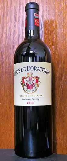 Clos de l'Oratoire is a Bordeaux wine from the appellation Saint-Émilion, ranked Grand cru classé in the Classification of Saint-Émilion wine. The winery is located in the Right Bank of France’s Bordeaux wine region in the commune of Saint-Émilion, in the department Gironde.