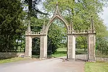 On the old Abergavenny-to-Raglan road stand the entrance gates, again reputedly by John Nash,[7] who did undertake work in South Wales. A lodge is set to one side. They are earlier than the house, of 1797.[7] The entry in Mee's The King's England suggests that the gateway came from the ruined mansion of Perth-hir near Rockfield but this is disputed.[lower-alpha 1][lower-alpha 2][16][17]