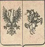 The Podlaskie Voivodeship of the Congress Poland was established on 16 January 1816.[3] Its coat of arms was divided vertically into two fields. The left half depicted a white eagle with yellow (golden) legs, with risen wings. The right half depicted a knight in a white (silver) armor, sitting on a white (silver) horse with a blue saddle and shabrack, standing on its back hoofs. The knight has a blue shield with a yellow (golden) cross of Lorraine on it, put on his left arm, and hold a sword in his right hand.[4] The voivodeship existed until 23 lutego 1837, when it was replaced by the Podlachian Governorate, which continued using said coat of arms. It ceased to exist in 1844, when it was incorporated into the Lublin Governorate.[4][5]