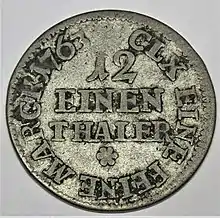 Thaler subdivisions that were minted as currency coins, whose nominal value thus also corresponded to their silver value, could also state their relationship to the Cologne Mark in the inscription. The Saxon 1⁄12 Thaler of 1763 in the photograph is inscribed with CLX EINE FEINE MARCK; confirming that 160 of these coins corresponded to the total weight of the Cologne Mark.