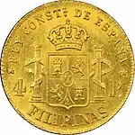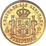 • In gold: 1, 2, 4 pesos; the 4 pesos weighing 6.766 grams of 0.875 fine gold