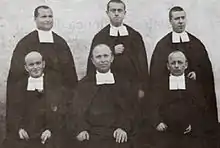 The founders of the Colégio do Carmo. Sitting: Brothers Xavier Domingos, Anastácio Pascal and Frumêncio. Standing: Inocencio, León and Fabiano Alberto.